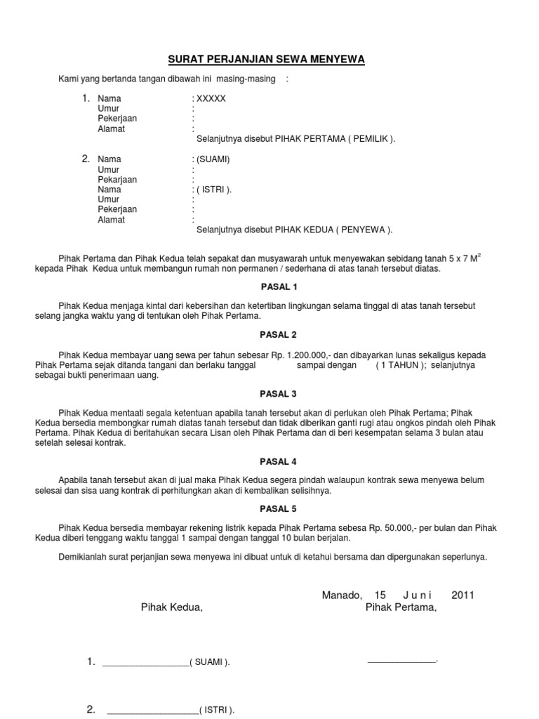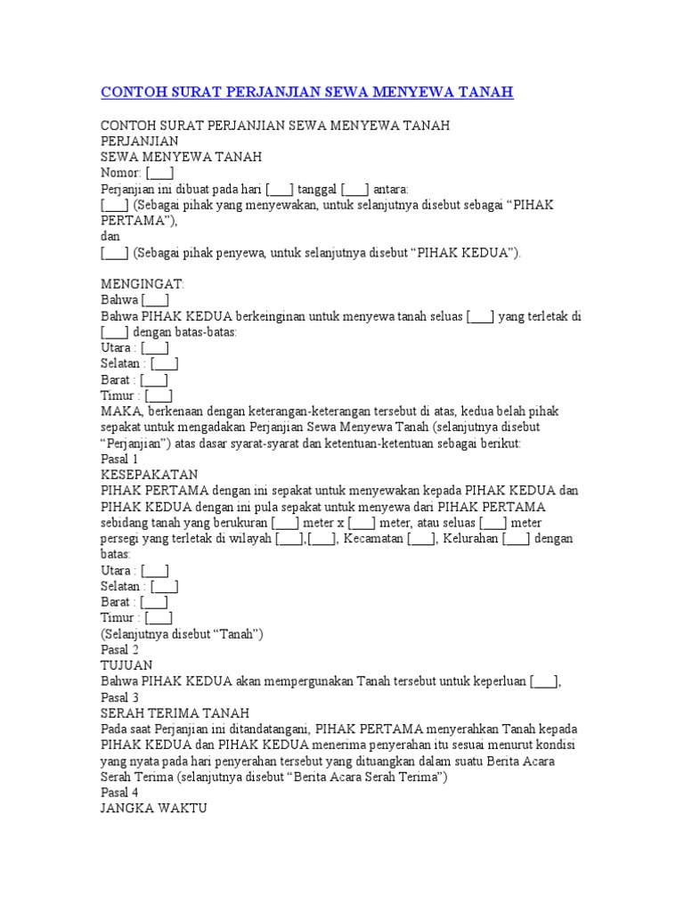 Ada banyak orang yang memiliki hutang kepada orang lain dan begitu juga orang yang memiliki piutang kepada orang lain. Selama surat perjanjian sewa tanah masih dalam masa berlaku, pihak kedua tidak boleh memindahkan hak penyewaaan baik secara keseluruhan maupun sebagian pada pihak ketiga, kecuali telah mendapat persetujuan tertulis dari pihak pertama terlebih dahulu. Buat judul surat perjanjian, contohnya surat perjanjian sewa tanah. Silahkan anda download surat perjanjian sewa tanah bumdes tahun 2020. Untuk urusan sewa menyewa tanah, yang terlibat adalah pihak penyewa dan tuan tanah. Yang bertanda tangan dibawah ini : Surat perjanjian dibuat secara ikhlas dari dalam hati dan tanpa adanya paksaan dari berbagai pihak manapun. Yang bertanda tangan dibawah ini : Surat perjanjian jual beli tanah. Entah itu menyewa mesin dengan kapasitas tinggi, mobil, tanah dan lain sebagainya. Surat perjanjian sewa ditulis pada kertas yang dibubuhi materai atau bisa juga di atas kertas segel. Surat perjanjian sewa tanah pada dasarnya memiliki poin yang tidak berbeda jauh. Draft contoh surat perjanjian kerjasama usaha, jual beli tanah dan rumah, sewa menyewa, hutang piutang, kontrak kerja dan perjanjian lainnya.