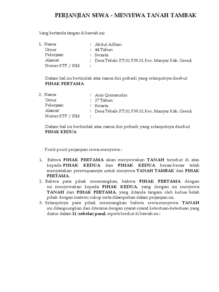 Syarat sahnya perjanjian sewa tanah. Surat perjanjian sewa tanah sawah. Tutup surat perjanjian anda dengan pernyataan bahwa surat perjanjian tersebut telah disetujui oleh kedua pihak tanpa paksaan dari pihak manapun. Perjanjian ini juga tidak berakhir apabila tanah dalam perjanjian ini dijual ataupun karena sebab apa pun juga menjadi milik atau dikuasai pihak lain. Silahkan anda download surat perjanjian sewa tanah bumdes tahun 2020.